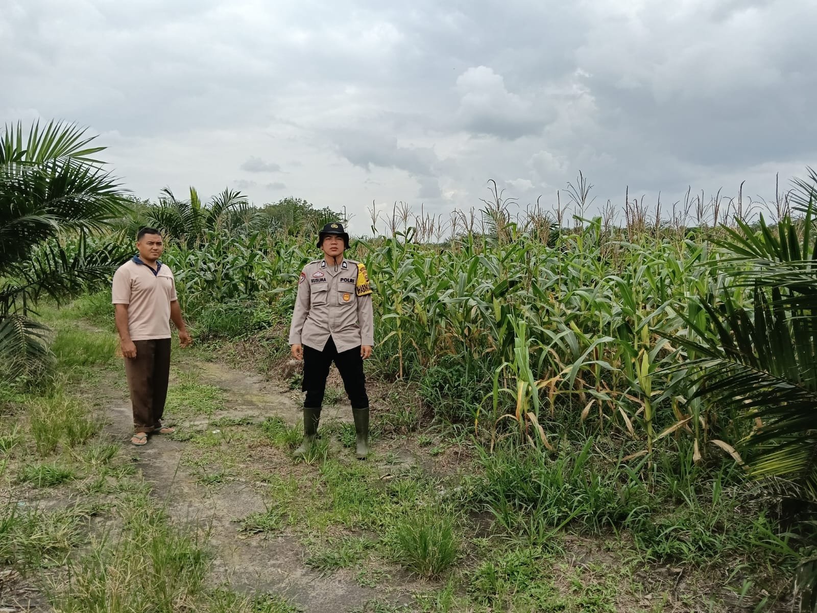 Personel Polsek Gelumbang meninjau langsung lahan milik Bapak Nariyontoko yang dimanfaatkan untuk penanaman jagung pipil. Lahan seluas sekitar 1 hektare tersebut ditanami jagung dengan sistem tumpang sari bersama tanaman kelapa sawit.