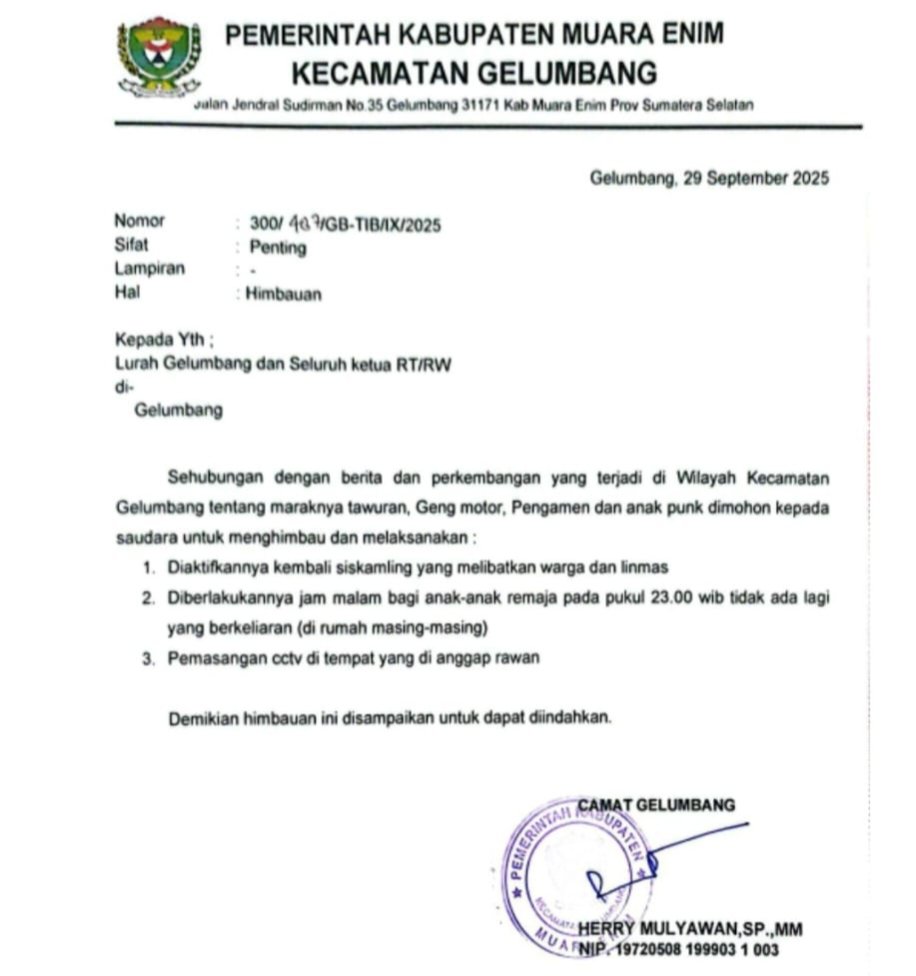 Gelumbang, Muara Enim -Pewarta Gelumbang Raya.my.id-Camat Gelumbang Heryy Muliawan.SP. MM.memberikan himbauan tentang pencegahan tawuran kepada masyarakat melalui Kepala Desa dan perangkat desa lainnya, seperti RT/RW, untuk mendorong pengawasan kegiatan remaja, menjaga kondusifitas wilayah, dan meminta peran aktif masyarakat dalam menangkal aksi tawuran.